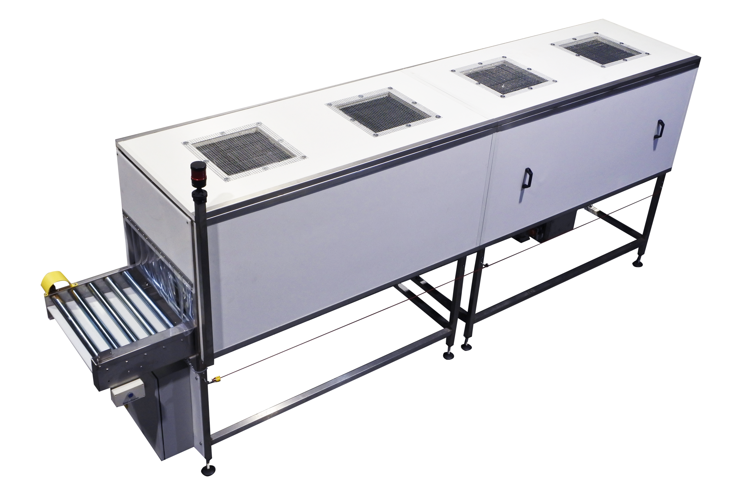 The finished system is a driven roller conveyor housed within a fully enclosed cooling tunnel. Products move smoothly through the conveyor while large industrial fans generate high-volume airflow across each item.