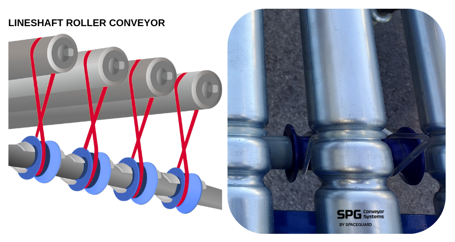 - Driven Conveyors / Electric Drives: In these systems, one or more rollers are powered (via motorized shafts, belts, or chains) to provide controlled, consistent movement. This makes them suitable for heavier loads, automated systems, varying speeds, accumulation zones, or integration with sorting/packing lines. The diagrams below show two example diagrams of motor-driven conveyors and lineshaft conveyors.