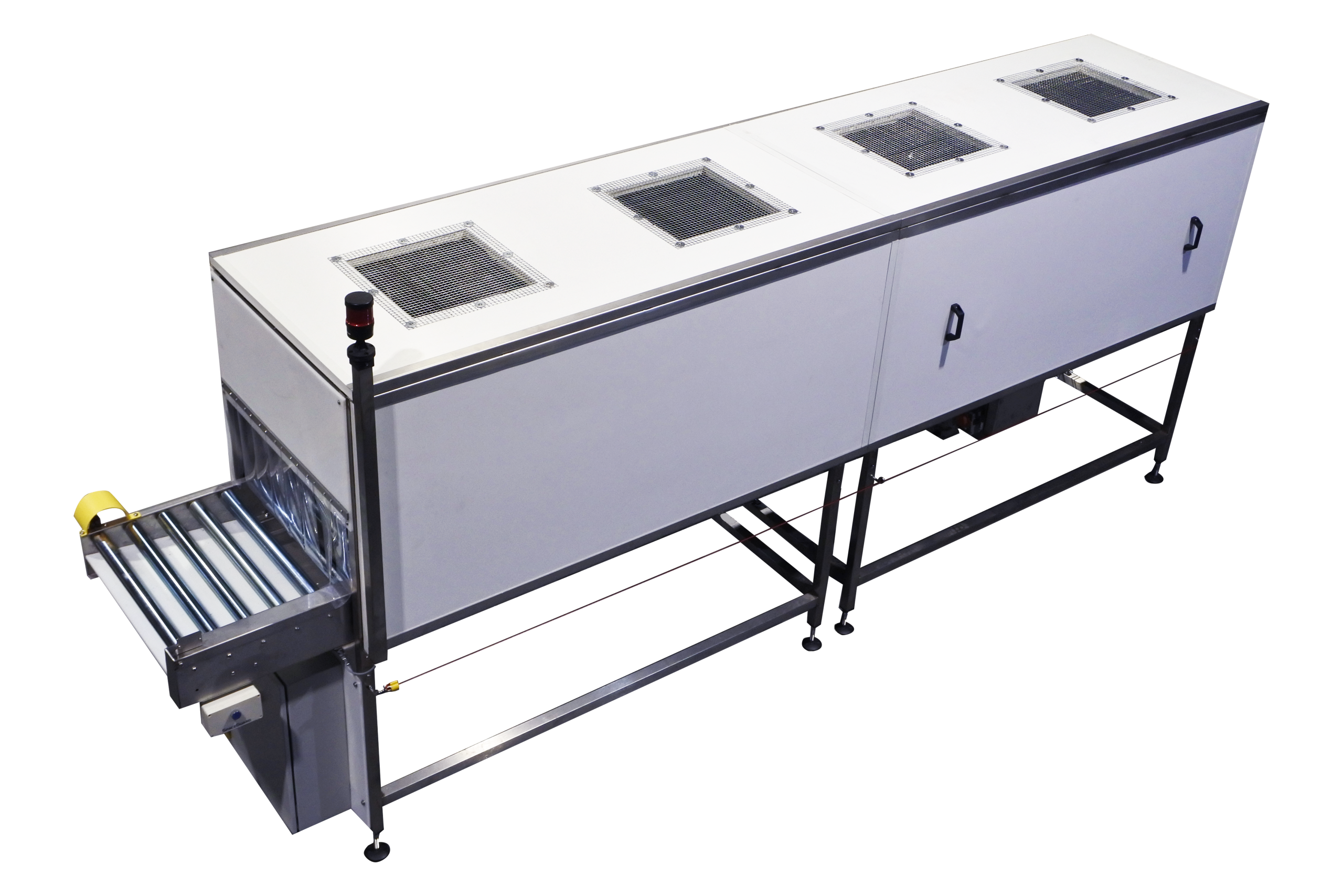 This is a finished bespoke system made for a previous customer using a driven roller conveyor housed within a fully enclosed cooling tunnel. Products move smoothly through the conveyor while large industrial fans generate high-volume airflow across each item. Panels can be slid aside to access the inside of the cooling tunnel and rollers.